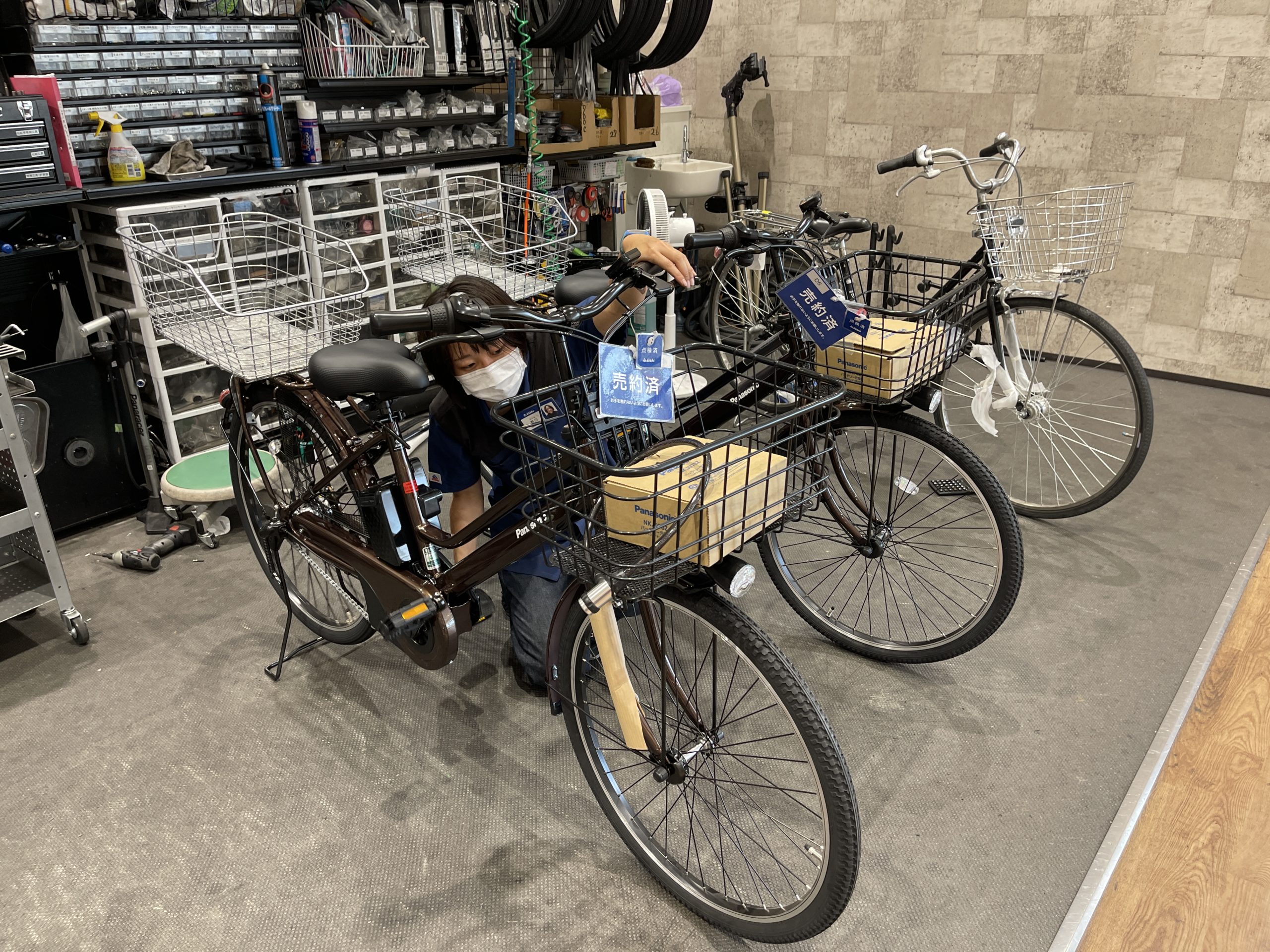 高圧洗浄機で一度洗ってから貸出用に整備します。全てアシスト自転車です。急坂でも楽々走れます。