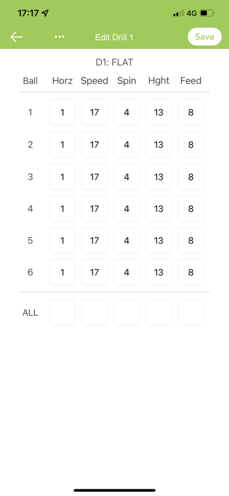 リモコン設定はSpeed(1〜20最速110キロ) Spinは(ー9〜+9)今回の動画は設定を覚えていませんがご覧の通りです。この位置から最速だとドライブを強く掛けないとアウトになります。今回の練習目的はコートの奥に強く打たれら場合の練習です。Feed(打つ間隔は1〜10)です。とてもじゃないですけど最速Feedでは速すぎて練習になりなせん。この機械は必ず6通り設定してからのスタートです。