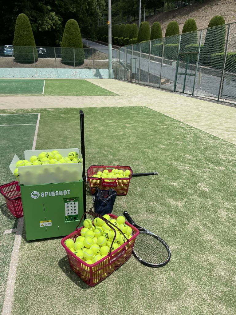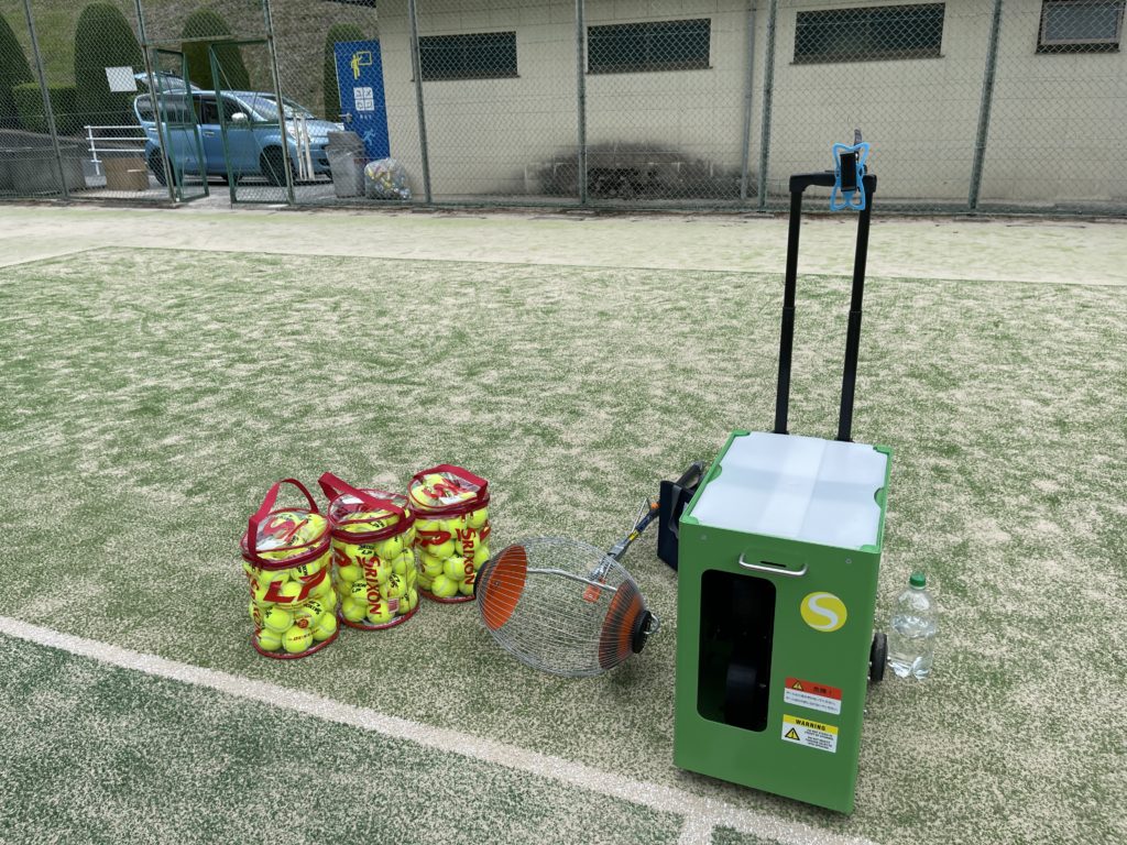 スピンショットプラス2では1バッテリーで2時間練習出来きます。外付けバッテリー接続キットで交換すると事で長時間使用可能、一人で3時間練習おすすめです、ボールを300用意してトレーニング開始、マシーンには、役100球入れて空になったら次の100級を入れて300球打ち終わってからボール拾いをします。ワンクール300球打って拾って30分!!